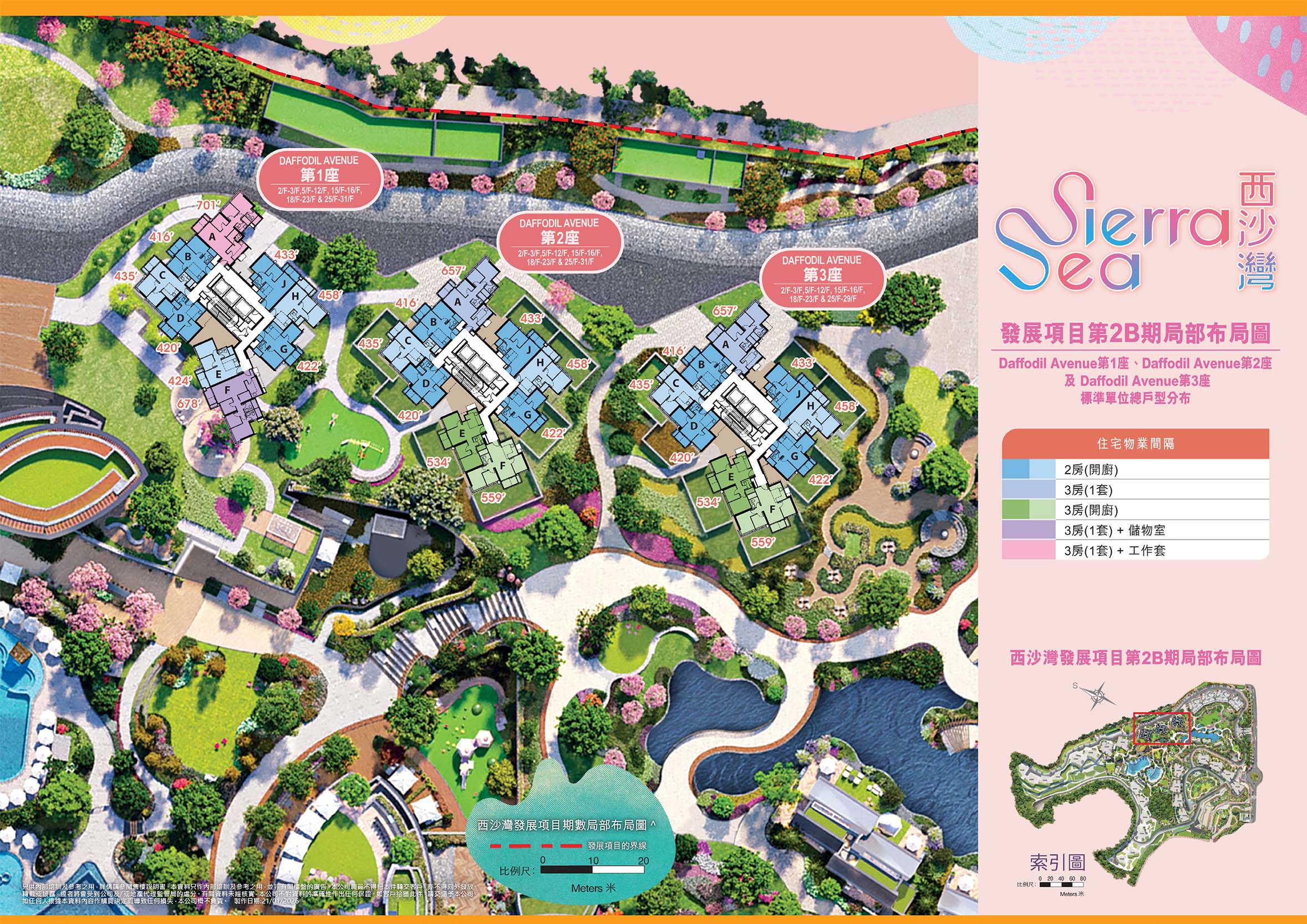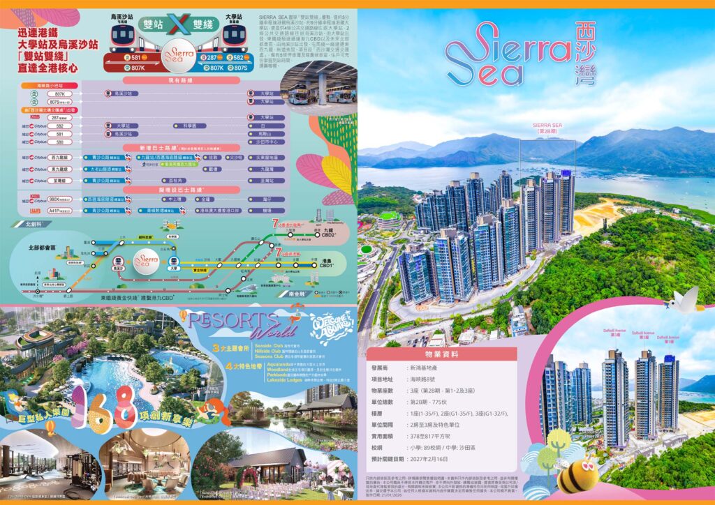 西沙 Go Park - Sierra Sea 2B期 Go Park新鴻基第2B期項目 - 共775伙 查詢Sierra Sea Go Park - 新鴻基地產 Sierra Sea 「SIERRA SEA」座落海映路8號,為新地歷來最大型私人住宅項目發展板圖之頭炮,2B期由3座大樓組成,提供 775個優質住宅單位 布局座向匠心獨運,大部份單位坐擁廣闊海景或翠綠山巒景致,部分單位更享西沙全新綜合地標「GO PARK」 景觀,貼心滿足不同住戶的需求。 Please enable JavaScript in your browser to complete this form.Please enable JavaScript in your browser to complete this form.聯絡電話 *預約示位 不同戶型分佈 🟦 2房開廚(雙門) 416-422呎 🟦 2房開廚 420-458呎 🟫 3房開廚 534-559呎 🟩 3房2廁 657呎 🟪 3房半2廁 678呎 🟪 3房半2廁+工人套 701呎 148萬呎會所 148萬呎度假式會所連同公用花園及遊樂地方,匯聚168項精彩設施。規模龐大的度假式會所國度「Resorts World」包括極具特色的3大主題會所Seaside Club、Hillside Club及Seasons Club,配合4大特色地帶,包括Woodland、Parklands、Aqualands及Lakeside Lodges,為住戶打造全方位度假享樂體驗。這個度假村的會所設施,為住戶帶來前所未有的生活享受,讓他們彷彿置身於度假天堂 運動聖地 佔地逾130萬平方呎,包括約100萬平方呎的多元化戶外運動公園「GO PARK Sports」以及約30萬平方呎匯聚多間運動消閒及餐飲娛樂商戶的「運動商業綜合部分」。 交通優勢 SIERRA SEA緊密連繫東鐵綫,東鐵綫向南一綫由大學站直達金鐘站,極速連繫港島CBD1,可比喻為『黃金快綫』;東鐵綫向北則連繫上水、羅湖、落馬洲及規劃中的科學園/白石角站,盡享『南金融、北創』的機遇。